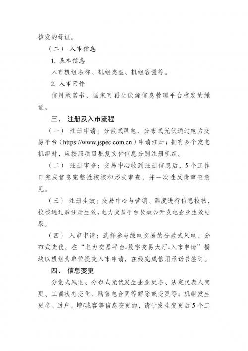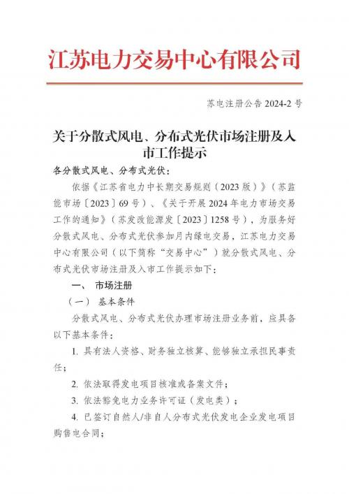 文件提出,依据《江苏省电力中长期交易规则(2023版)》、《关于开展2024年电力市场交易工作的通知》,为服务好分散式风电、分布式光伏参加月内绿电交易,江苏电力交易中心有限公司就分散式风电、分布式光伏市场注册及入市工作提示如下: