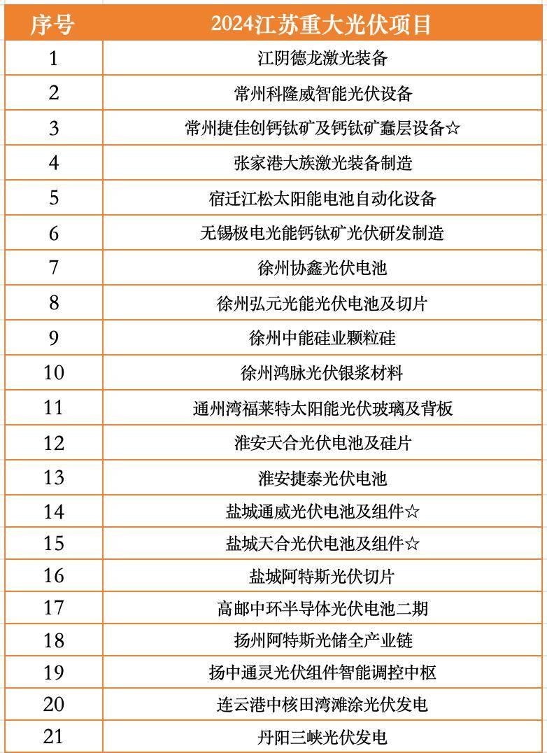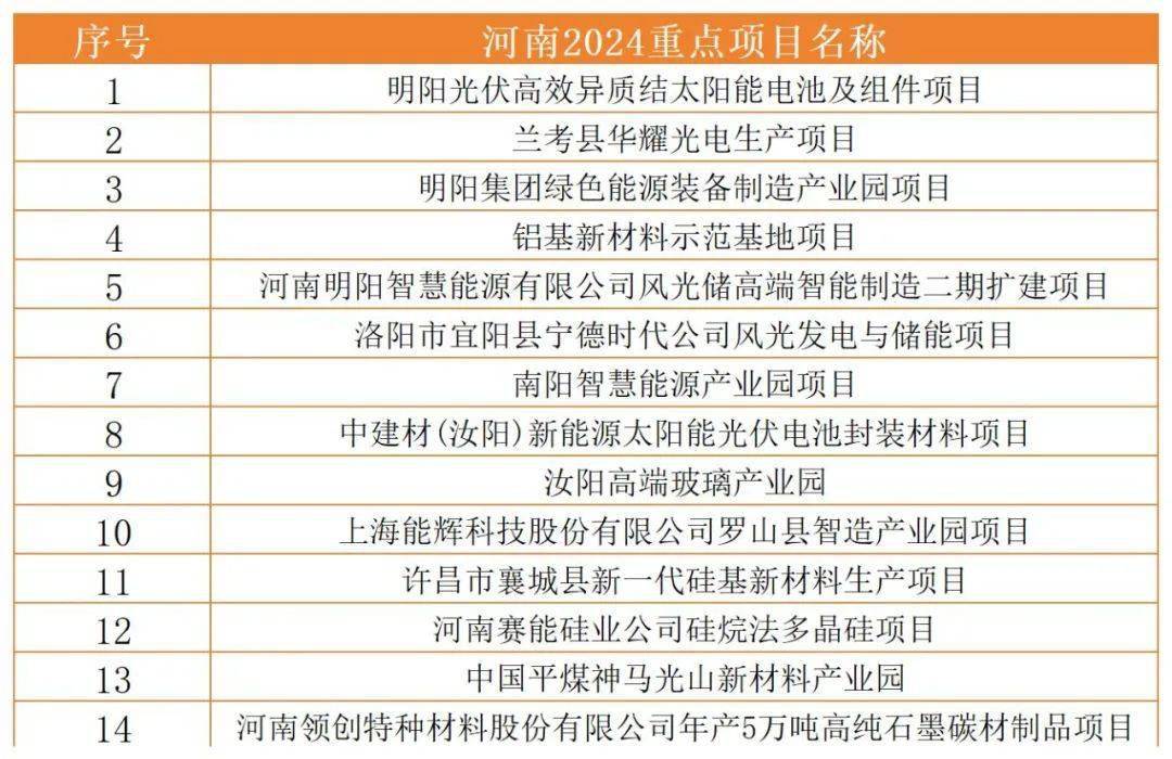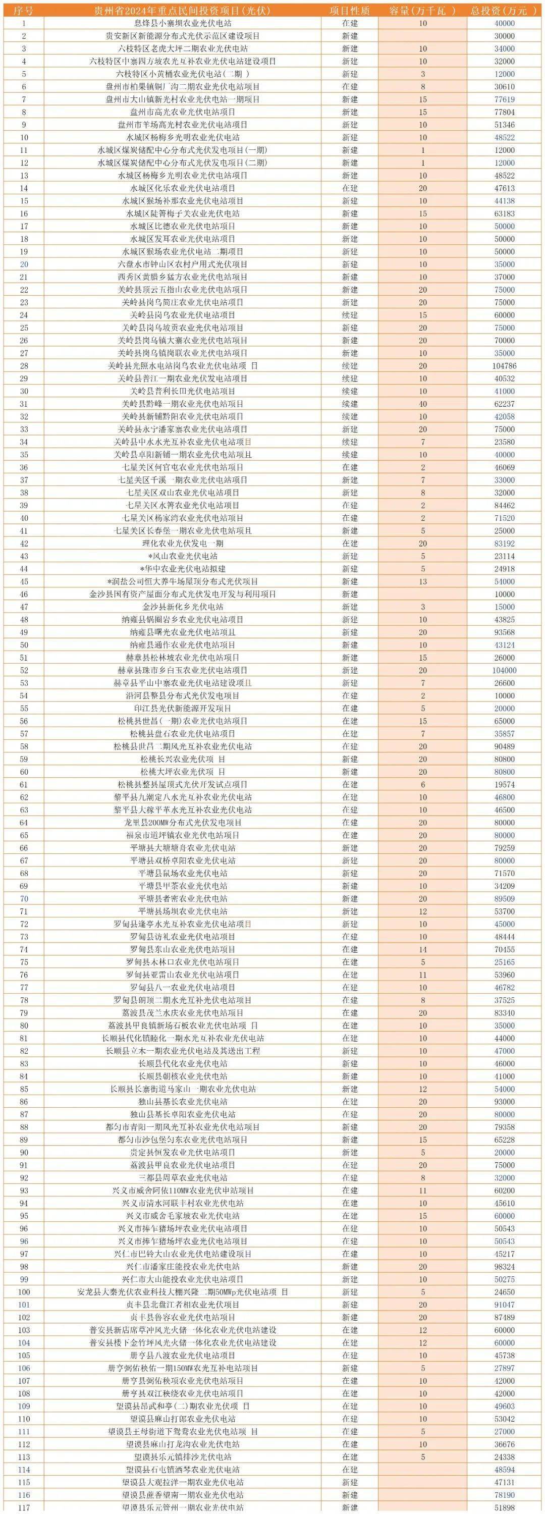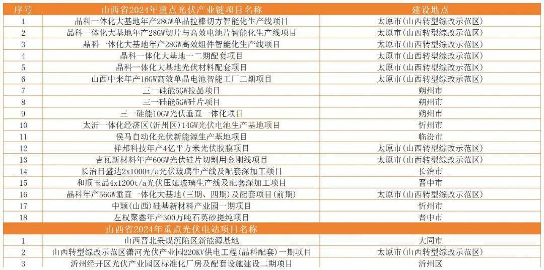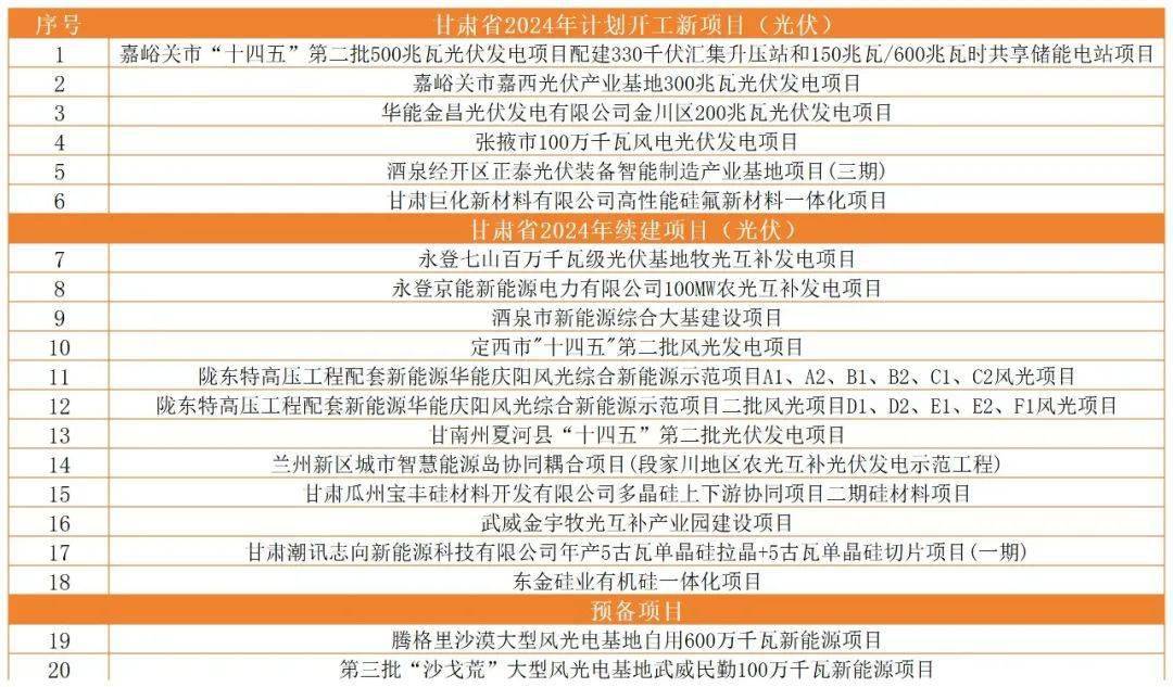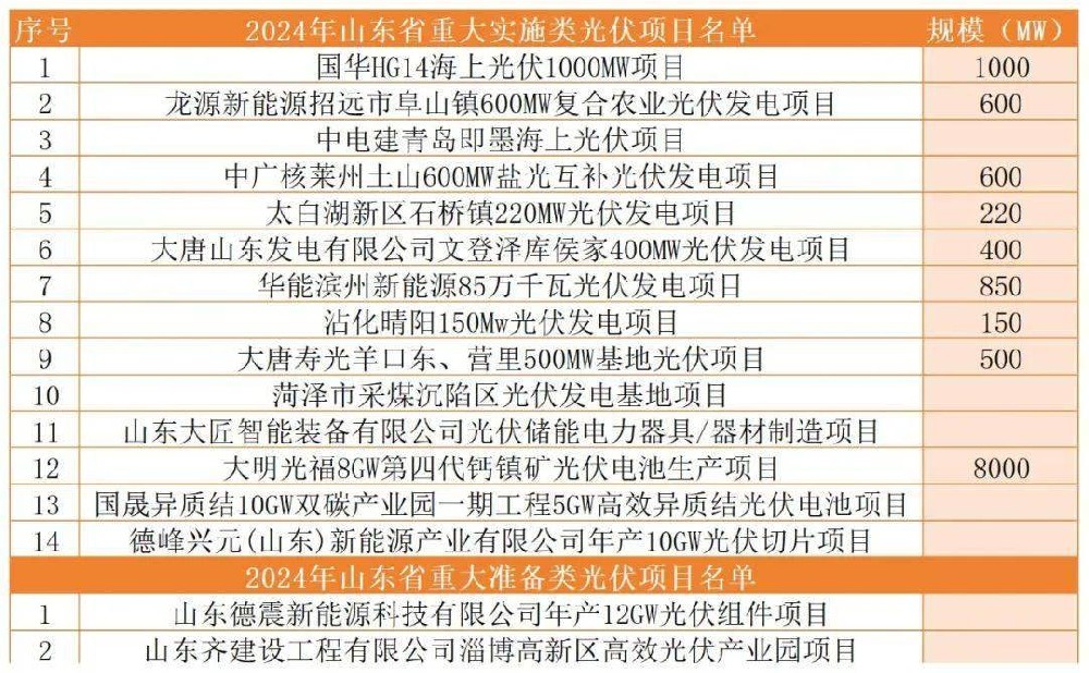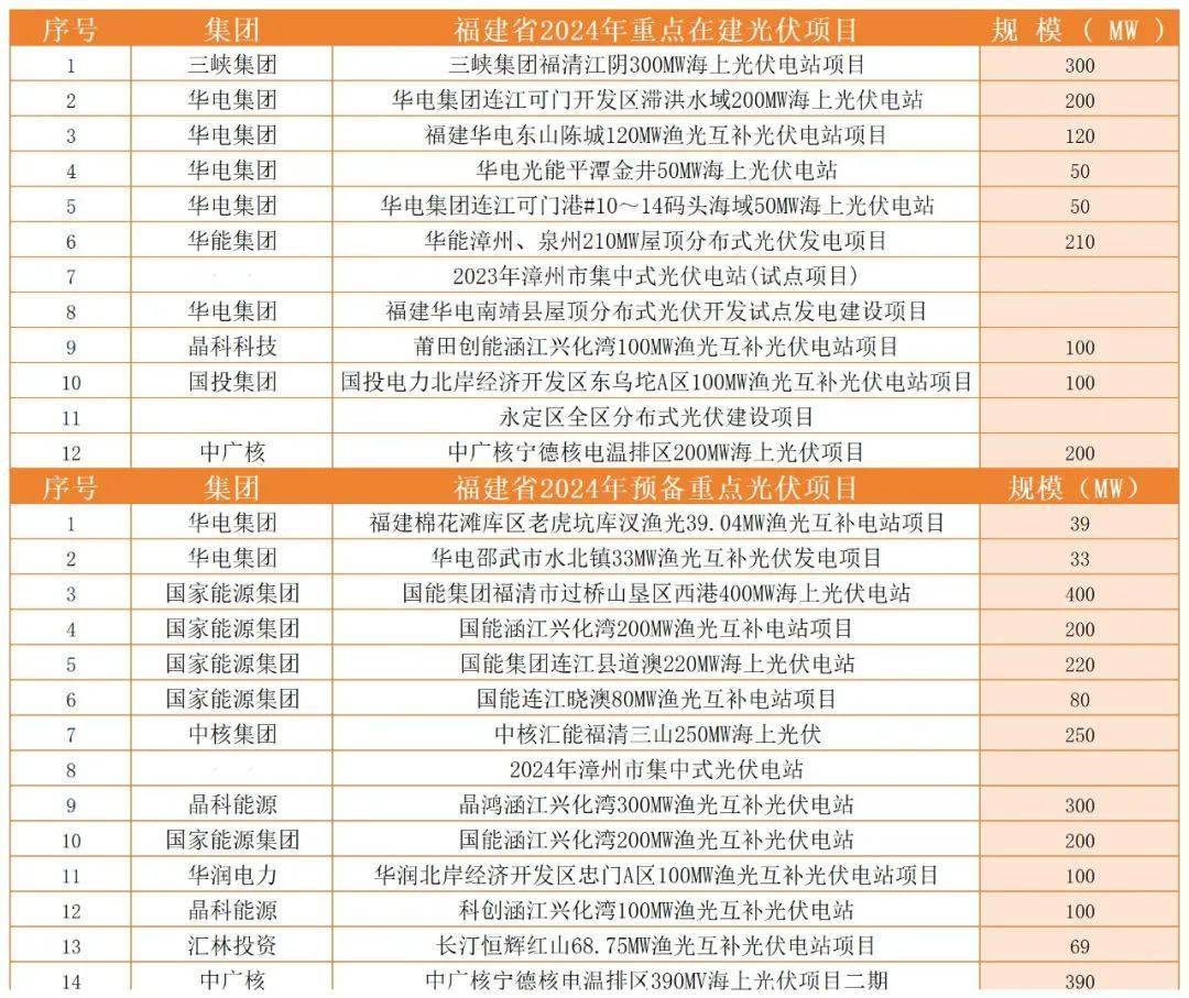 此前,国家电网相关数据平台中公布了多个省市的光伏、风电等新能源数据。25省市2023年光伏装机明细数据出炉,光伏总体新增约175GW,集中式约占88.8GW,分布式约为86.2GW。其中,山东、河北两省的累计装机规模已突破50GW,紧随其后的江苏、河南、浙江也已突破30GW,向着50GW的目标迈进。 而在近日全国多个省市所公布的2024重大项目名单中,上述多省依旧表现出对光伏产业的重视。新能源领域中所涉及的大批光伏项目,涵盖硅料、硅片、电池片、组件、辅材、光伏电站及运维等一体化产业链,将持续为全国能源转型注入新的动力。 山东 山东省发布《关于下达2024年省重大项目名单的通知》,2024年省重大实施类项目555个,2024年省重大准备类项目45个。 经统计,共包含16个光伏项目,省重大实施类项目名单14个,省重大准备类项目名单2个。详见下表: 河北 河北发改委发布2024年省重点建设项目名单。2024年河北省重点建设项目共计639项,总投资1.38万亿元,年度预计投资2200亿元。 经统计,包含光伏项目14个、装机规模约7GW。详见下表: 江苏 江苏省人民政府下发2024年江苏省重大项目名单、2024年江苏省民间投资重点产业项目名单。2024年江苏省民间投资重点产业项目共计200个,2024年江苏省重大项目名单中实施项目450个,储备项目60个。 经统计,重大光伏项目21个,储备项目1个,民间投资重点项目7个。详见下表: 河南 河南省重点项目建设领导小组印发通知,公布2024年河南省第一批重点建设项目名单,今年第一批省重点建设项目520个,总投资约2.1万亿元,年度计划投资约5830亿元。 经统计,有14个项目与光伏领域相关。详见下表: 浙江 浙江省发改委发布2024年度拟新增省重大产业项目名单公示,实施类90个项目,预选类24个。 其中,2024年度提前批省重大产业项目名单(实施类)中涉及6个光伏项目。详见下表: 四川 四川省人民政府公布2024年四川省重点项目名单,共计700个重点项目。其中,新开工项目196个,续建项目504个。 经统计,光伏项目共11个,新开工项目有5个,续建项目有6个。详见下表: 山西 近期,山西省政府办公厅已印发了《2024年省级重点工程项目名单》,共计663个省级重点工程项目(不含涉密项目)。 经统计,共有21个光伏项目,包括18个光伏产业链项目,3个光伏电站项目。详见下表: 甘肃 甘肃省发改委发布关于征求《甘肃省2024年省列重大建设项目投资计划(草案)》意见的函,包含34个能源项目,总投资1799.235亿元。 经统计,约涉及20个光伏项目。详见下表: 贵州 贵州省发改委发布关于大力推进“2024年2000个重点民间投资项目的通知”。 经统计,近120个光伏项目。详见下表: 福建 福建省发改委发布关于印发2024年度省重点项目名单的通知,福建省2024年度省重点项目1593个,总投资4.28万亿元,年度计划投资6807亿元。 经统计,包含在建光伏项目12个,省预备重点光伏项目14个。详见下表: 海南 海南省发布重大光伏项目清单,省重大正式项目295个,总投资7744亿元,年度计划投资1255亿元。 经统计,包含5个重大光伏项目。详见下表: 广州 广州发改委发布关于印发广州市2024年重点建设项目计划的通知,2024年市重点建设正式项目713个,年度计划投资3608亿元。 经统计,光伏重点项目共5个,包含重点建设项目4个,预备项目1个。详见下表: 天津 天津市发改委发布关于印发天津市2024年重点建设、重点储备项目安排意见的通知,天津市2024年安排市级重点建设项目807个,重点储备项目253个。 其中,涉及30+个重点光伏光伏项目。详见下表: 转载内容仅供学习参考,版权归原作者所有,如有侵权,请与我们联系删除!